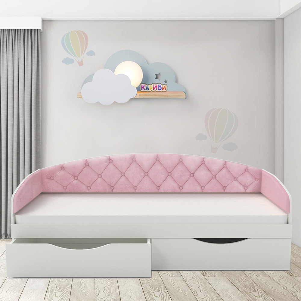 Обивка мягкой спинки сделана из высококачественного премиального велюра, обладающего износостойкостью и долговечностью. Мягкость спинки придает ППУ повышенной плотностью, которая используется исключительно для изготовления детских матрасов.
