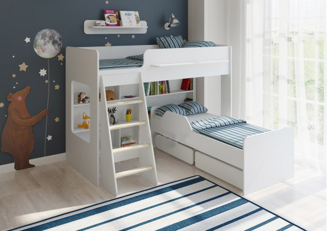- Под верхним спальным местом в игровой зоне располагается стеллаж. Стеллаж отлично подходит для хранения игрушек, удобен для поддержания порядка.