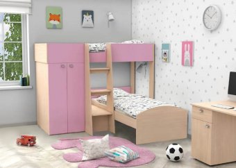 В базовую комплектацию входят: двухъярусная кровать, лестница, шкаф для одежды (3 полки + штанга) и прикроватная полочка - столик возле нижнего яруса под лестницей.