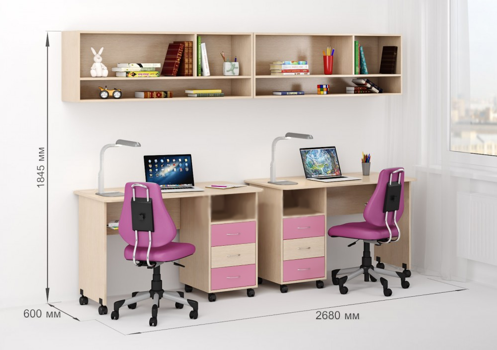 Два стола Л-03 - Комфортный письменный стол Л-03 оборудован поворотными колесами, легко перемещается по полу, задвигается и выдвигается. Три выкатных ящика стола обеспечат удобное хранение канцелярии, письменных, учебных и прочих принадлежностей. Над ящиками открытая полка для мелочей, которые будут всегда под рукой.