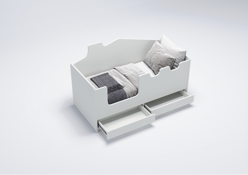 Кровать "Л-K202.04 домик" оснащена двумя выдвижными вместительными ящиками, оборудованными телескопическими направляющими с фиксаторами. Это обеспечивает легкость и плавность выдвижения ящиков, а также их надежную фиксацию. Такое решение позволяет эффективно использовать пространство под кроватью для хранения игрушек, одежды и других детских принадлежностей.