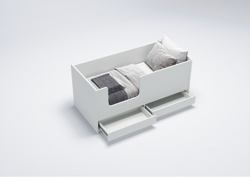 Уникальной особенностью модели "Л-K202.04" являются два выдвижных вместительных ящика. Они оборудованы телескопическими направляющими с фиксаторами, что обеспечивает плавное выдвижение и фиксацию ящиков. Это позволяет эффективно использовать пространство под кроватью для хранения игрушек, одежды и других детских принадлежностей.