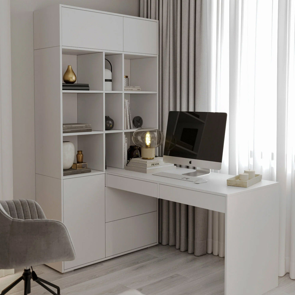 ОписаниеПисьменный стол стеллаж — отличный выбор для дома и офиса, в современном угловом дизайне. Сборка шкафа на обе стороны. Качественные шариковые направляющие с мягким ходом, которые обеспечивают полное открытие. Все дверцы открываются от нажатия (Push to Open)
